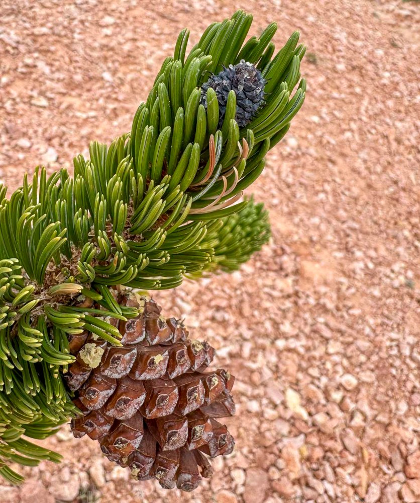 こんなにヒョロヒョロとして頼りない枝の先で頑張って生きていました。ブリスタルコーンという名前は硬い毛でできているボトルブラシのような形からきているようです。 It was struggling to survive on the tip of such a spindly, flimsy branch. The name “Bristlecone” seems to come from its bottlebrush-like shape made of stiff hairs.