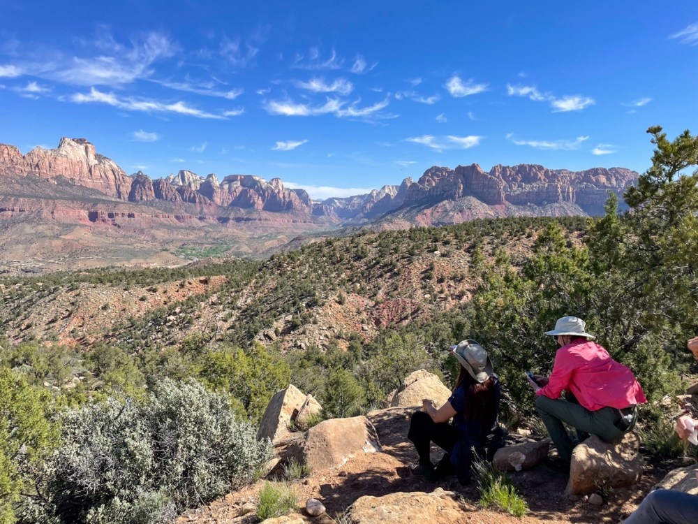 ザイオン国立公園の岩山を眺める場所で休憩です。 We took a break at a place with a view of the rocky looking mountains of Zion National Park.