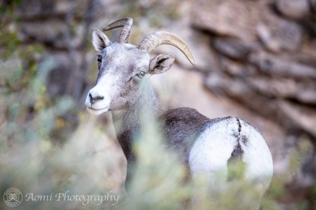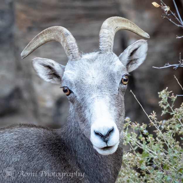 ビッグホーンシープ:ウシの仲間なので、オスもメスも生え変わらない。ネバダ州のバレーオブファイヤー州立公園でのショット。角は年輪の役割を果たしているので、角の輪を見て年齢がわかるそうです。