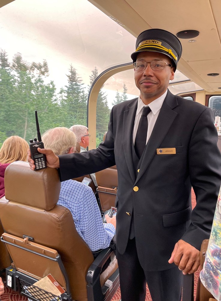 車掌さんが登場し、旅の終わりを告げています。ちょっと名残惜しい。Mr. Conductor came to our train car telling us that our trip would end soon. It was sad to leave so soon.