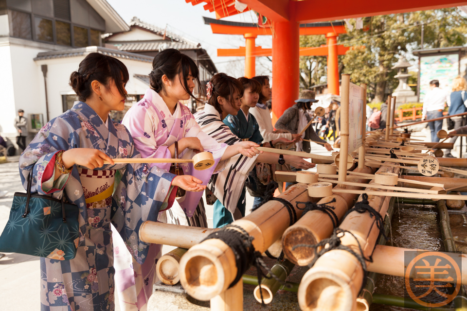 いやはや、ここでもてんやわんや状態。着物を選んで、メイクとヘア、そして着付け。すでに観光客で満杯なのに、京都近辺の大学の卒業式が拍車をかけます。ほとんどが10代、20代の若者だからその熱気たるや大変なものです。そう、私達がダントツで年寄りでしたが。そんなの気にしません。
