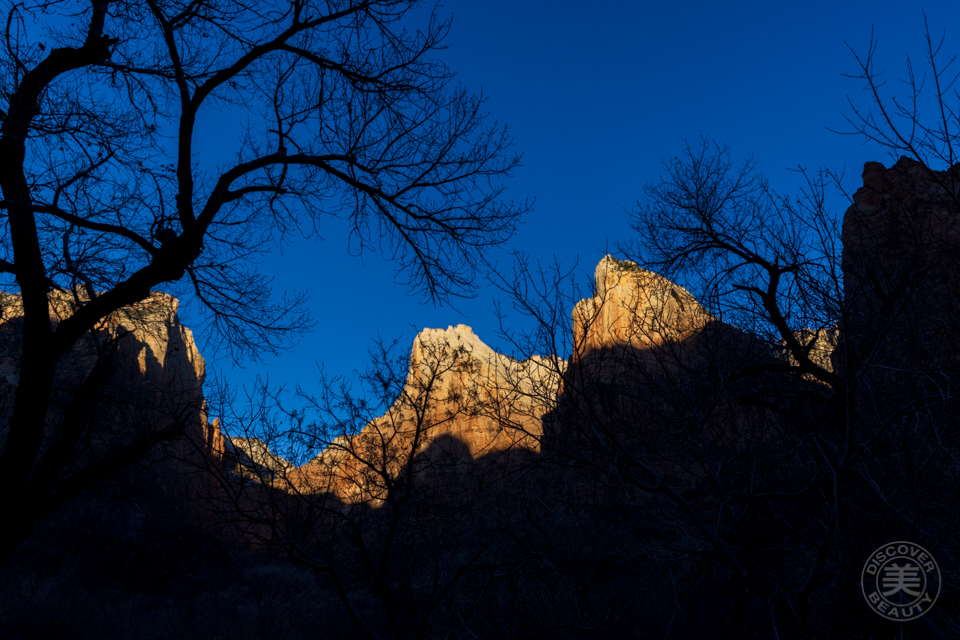 翌朝、日の出前にザイオン国立公園内に入りました。イーストテンプルかな?月が沈む前にもう光を浴び始めています。We went inside Zion National Park before sunrise the next day. Could it be the East temple? The tip of it had already gotten the morning light even before the moon set.