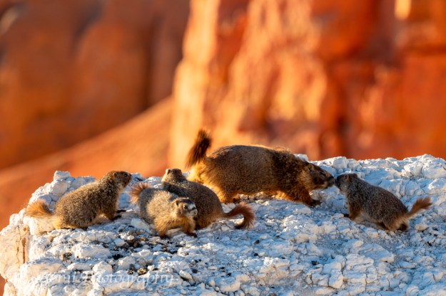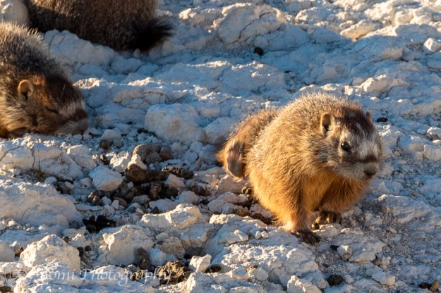 その後8時半過ぎまでブリスタルコーンパインを撮りに行った帰り道、まだいてくれるに違いないという気がしていました。そして、やっぱり、いました。でも、なんと驚いたことに家族全員勢ぞろいです! – Then, I joined Banchan to photograph pine trees till a little after 8:00pm. On the way back, I had a feeling that the marmot was still there. And, indeed, he was there. But this time, he had company. The entire family was there as well!