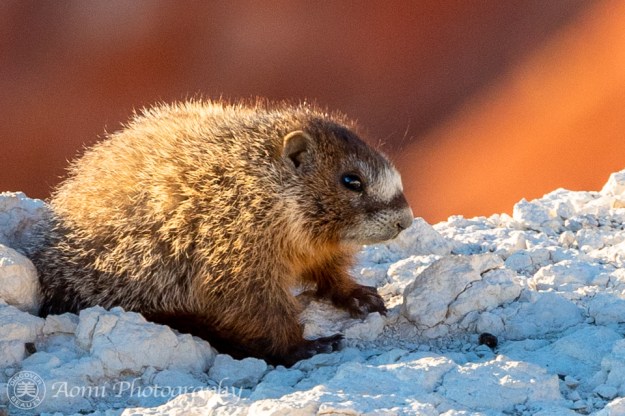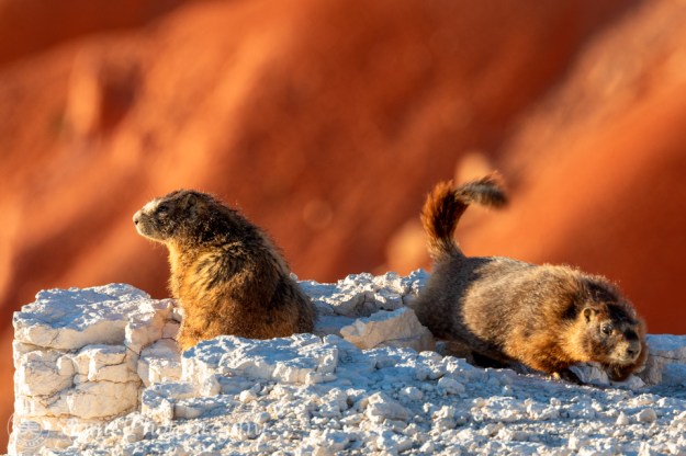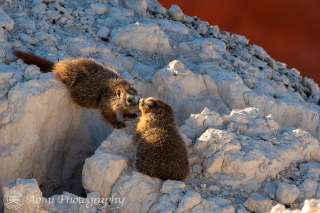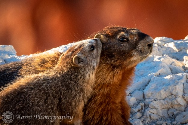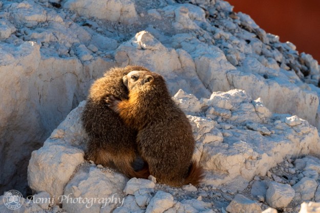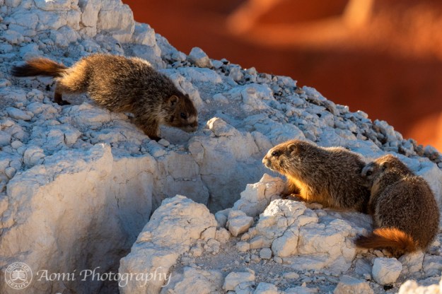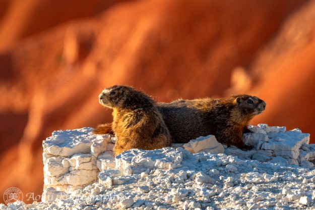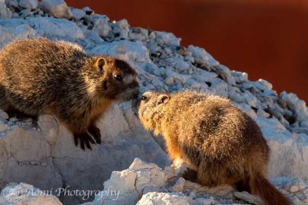 マーモットの赤ちゃんたちが崖の上から夕日を眺めています。こんなクリスマスと誕生日が一気にやって来たような幸運ってあるでしょうか。- Two baby marmots were enjoying the sunset view from the cliff. We were so lucky to have had such a golden opportunity. It’s like Christmas and my birthday combined.