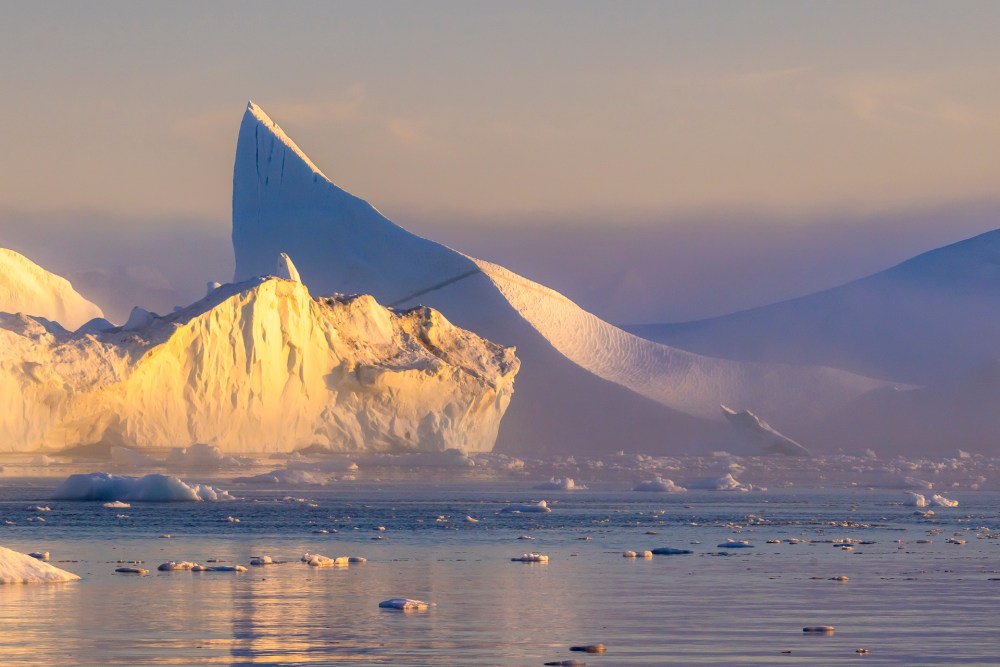 時折聞こえる爆発音は、実は氷山の一角が亀裂して砕け落ちる音でした。 The occasional sound of explosions was actually the cracking and shattering of a section of the iceberg.