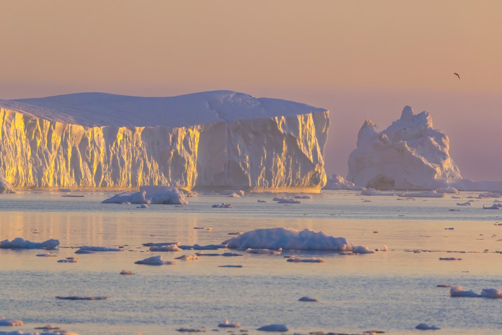 太陽が沈んでいくと、薄紅の中、遥か彼方にディスコ島が見えていました。 As the sun set, Disco Island was visible in the distance in a light red.