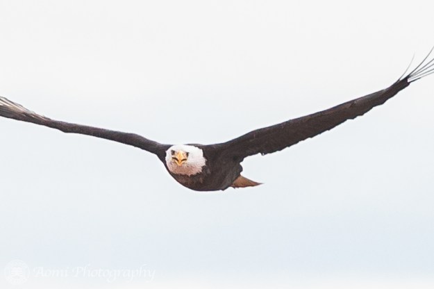 そして、期待通り白頭ワシに出会うことができました。空高く飛行していたので、私の400mmレンズではこれが精一杯でした。- And we could indeed see a Bald Eagle. It was flying so high in the sky, this is my best shot with my 400mm lens.