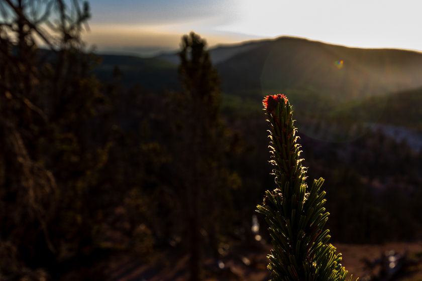 こんなにヒョロヒョロとして頼りない枝の先で頑張って生きていました。ブリスタルコーンという名前は硬い毛でできているボトルブラシのような形からきているようです。 It was struggling to survive on the tip of such a spindly, flimsy branch. The name “Bristlecone” seems to come from its bottlebrush-like shape made of stiff hairs.