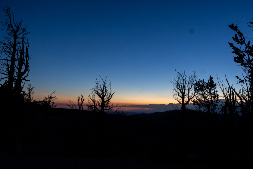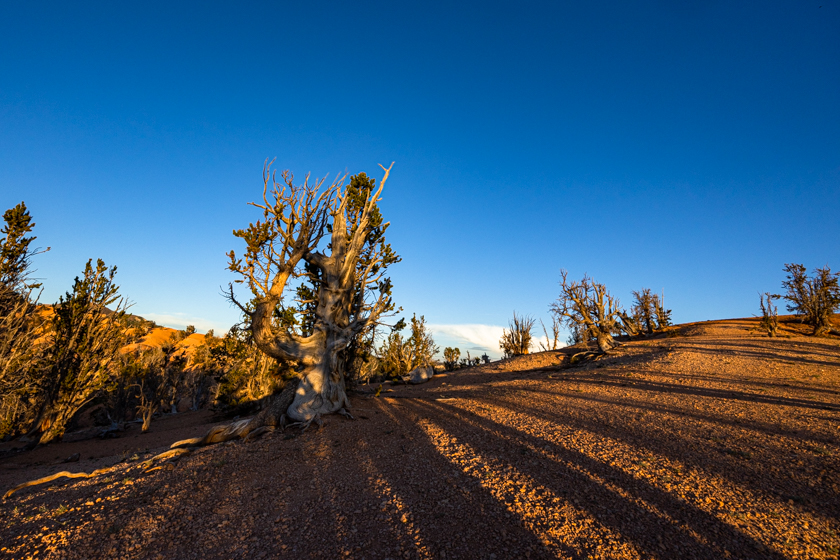 石灰質の粗悪な地質、そして強風と寒さの中を生き抜いてきたブリスタルコーンの丘は、時間が止まったようにゆっくりと流れています。だからでしょうか。4000年以上も生き続けている木もあるということです。 The hills of bristlecone pines, having survived in poor limestone soil and enduring fierce winds and cold, seem to flow as if time has stopped. I wonder, is that why? Some trees have lived for over 4,000 years, like some in the White Mountains.