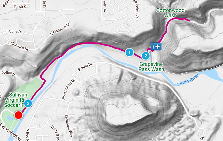 あー、コットンウッドの山間に入らなくちゃいけないところを、バージンリバー沿いに走ってたんだ。Oh no, I ran along the Virgin river all the way to the mid-point instead of the correct course into Cottonwood wash.