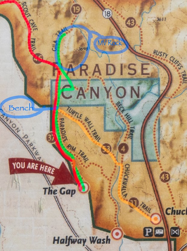 MV Rock と回りのトレイルマップです。今回は緑色でハイライトされたパラダイスリム を登って見ました。前回はオレンジ色のタートルウォール。急な道だけど、距離が短くなり、それだけ早くたどり着く事ができるんです。- See the map of MV Rock and trails below. We took the orange highlighted trail once before, but we took the green highlighted trail this time. It’s steeper, but the distance is so much shorter so we could get there in less time.
