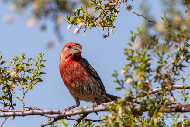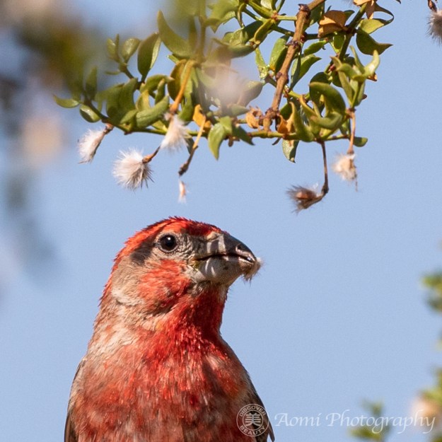 なるほど。クレオソートのあたりでよく見かけると思ったら、棉ボールの中には種が入ってるんですね。綿毛の中から種を取り出して、それを食べてたんだ。だからお口の周りに綿毛がくっついてるのね。 – Now I understand why I find them in Creosote bushes often.  There are seeds inside the fluffy puff balls.  House Finches carefully extract the seeds and eat them.  That’s why the fluffy things are around his beak.