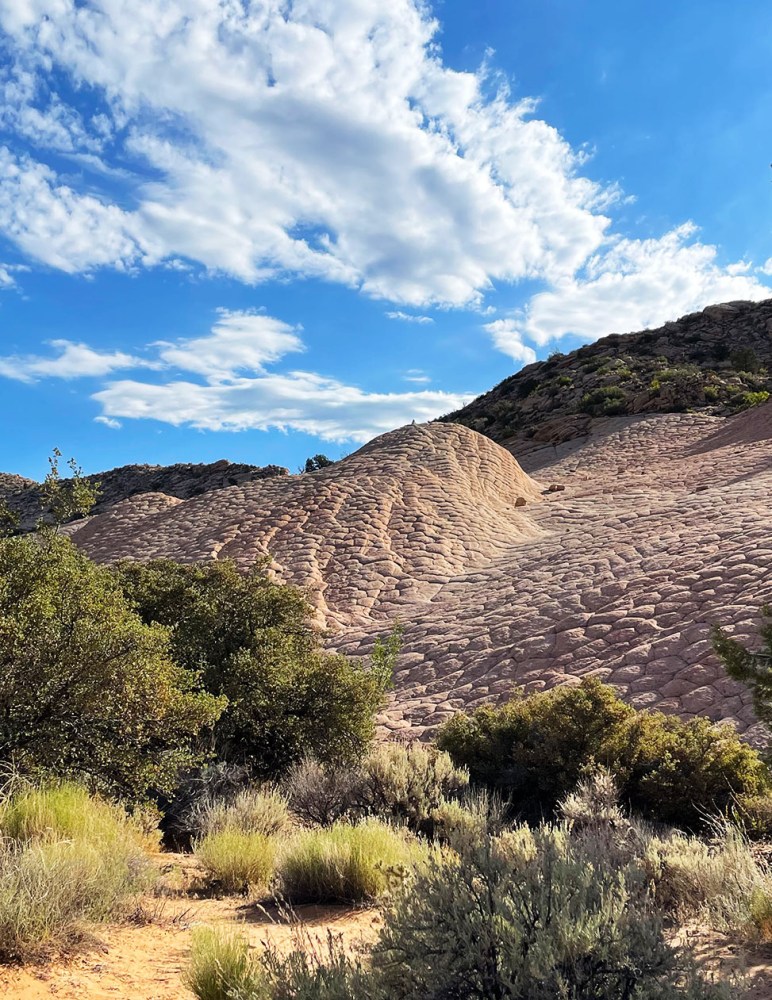こちらの写真はモキマーブルがまだ完全に分離されていない段階です。雨が降って水にさらされることにより砂岩の侵食が進むと、ポロリと分離するんですね。面白いです。 The picture below shows a moqui ball that is still attached to the sandstone wall. I can see that rain water eroded some of the sand around it. I wonder how long it will take for this particular ball to come out from the wall as the erosion continues. Isn’t it interesting?