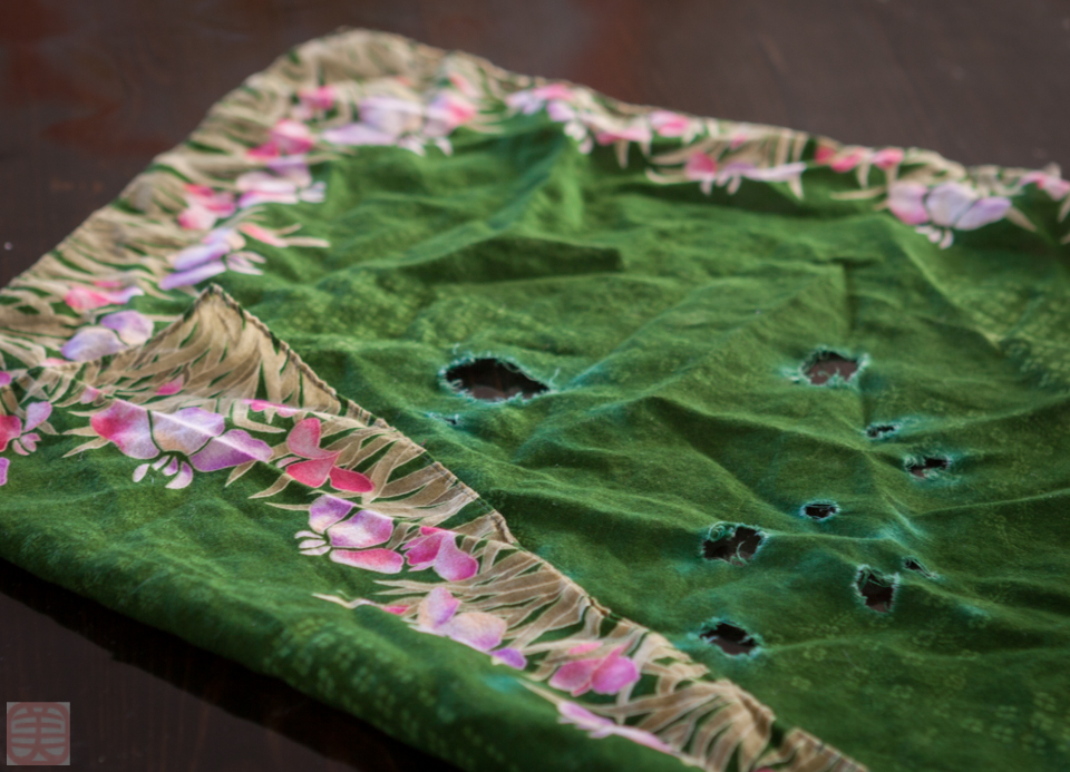 小さい白黒の水玉模様が手ぬぐいです。白がしっかり白になるように白い紙の選択に苦労しました。