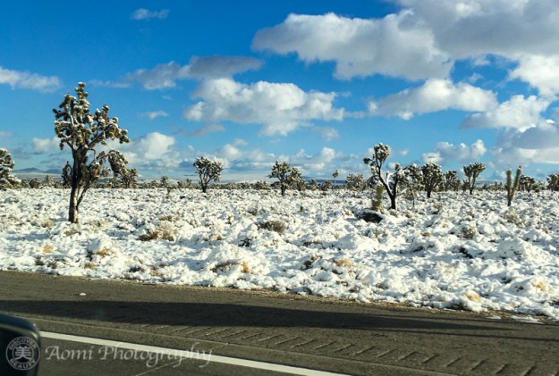 こんなに雪を被っているジョシュアツリーを見たのは初めてです。砂漠地帯で暑いというイメージからは程遠い。- It was my first time seeing them with snow on them. It’s far from the image I had had till then of living in a hot desert area.