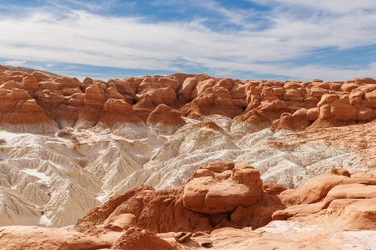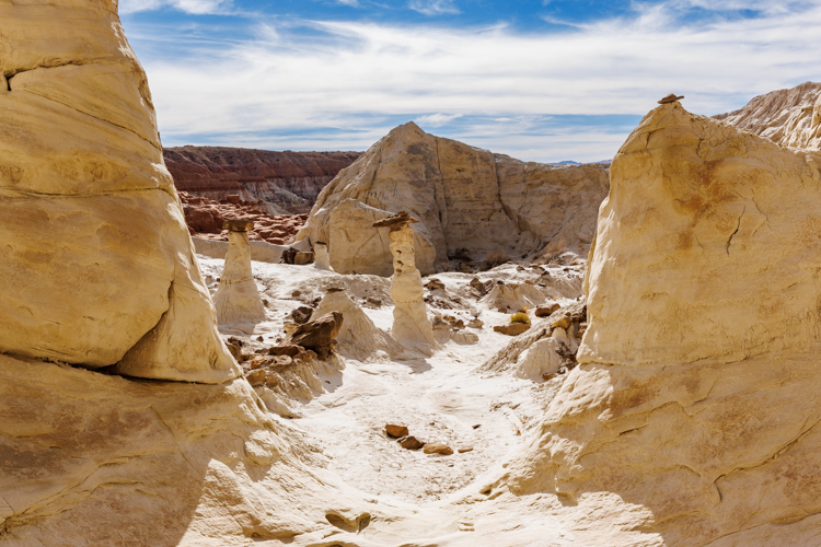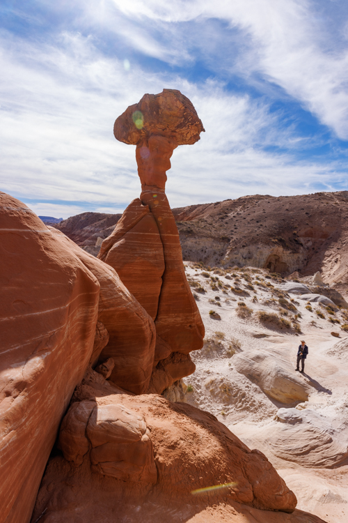 ユタ州にあるトッドスツールズと名付けられたこの場所は、駐車場から1.3km 歩けばつける場所です。でも、面白い場所が奥の方まで続いているので、ぐるりと回ると往復4kmぐらいになります。 The Toadstools in Utah is about a 0.8 mile hike away from the parking lot of the highway. But you can keep going to deeper sections of the park where there are even more interesting toadstools. So, it is about a 2.5 mile round trip hike.