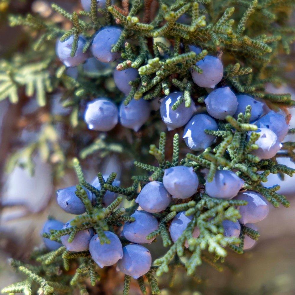 わー、ジュニパーの実がいっぱい! Wow, lots of juniper berries!