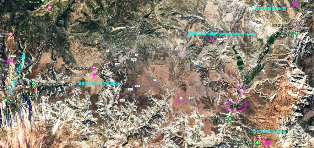 マウントカーメルジャンクションの近く、空は雲に覆われ暗い。そこで4種類の大きな鳥に出会った。以下、地図なんですが、わかるかな?HWY9と89がぶつかる所がお勧めのカーメルジャンクションです。 The sky was dark with thick clouds on that day around Mt. Carmel Junction. I made a map of the area east of Zion. I hope you can read it. The junction of Hwy 9 and 89, is called Mt. Carmel Junction. It is my recommendation to visit there if you like birds.