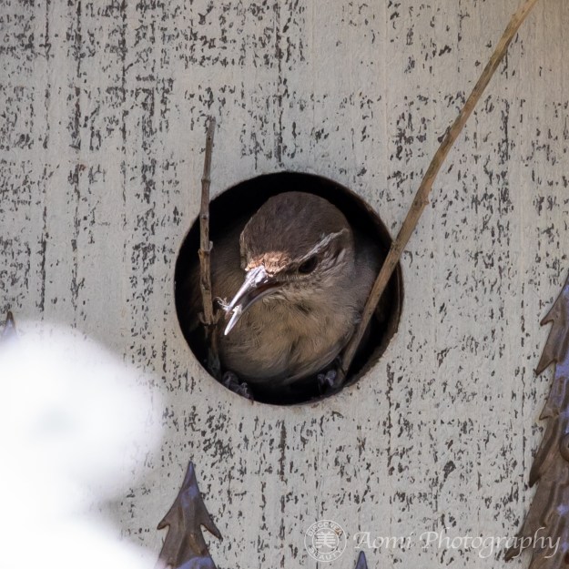 翌年にはシロハラミソサザイが裏庭のゲストハウスを訪れてくれました。 The following year, a Bewick’s wren visited our backyard guesthouse.