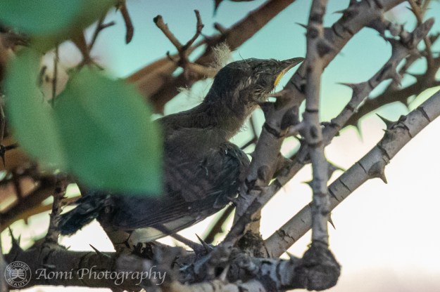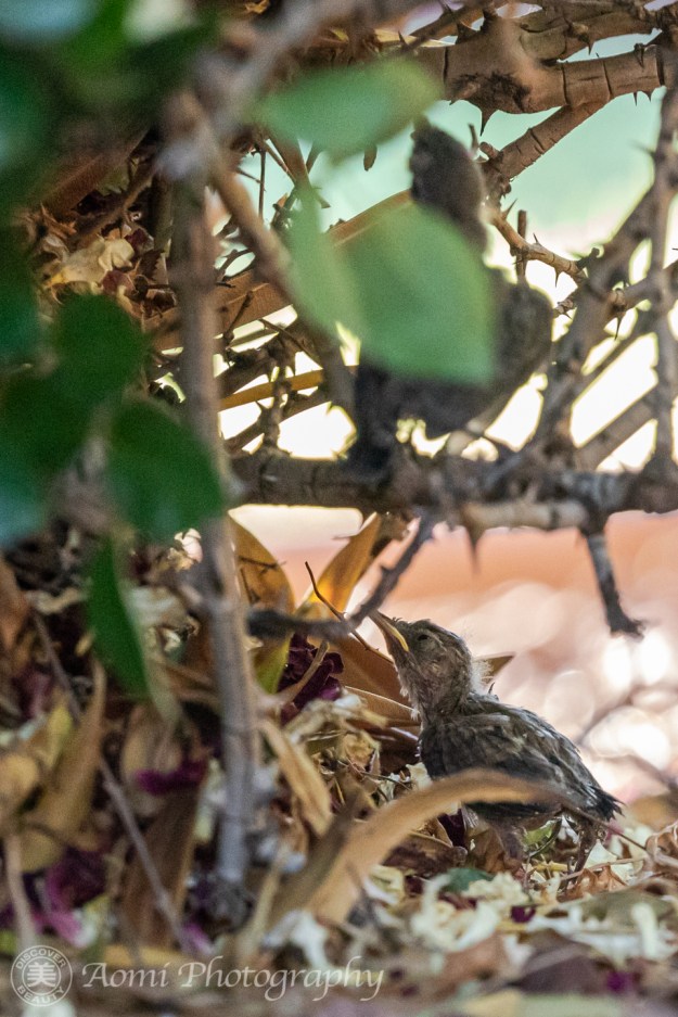その行方を追いかけてみると、なんと、野バラの木の下、生まれたばかりの3羽の雛たちがお母さんからエサをもらおうとしていました。 I followed their whereabouts, and to my surprise, I found three newborn chicks under a wild rosebush, trying to get food from their mother.