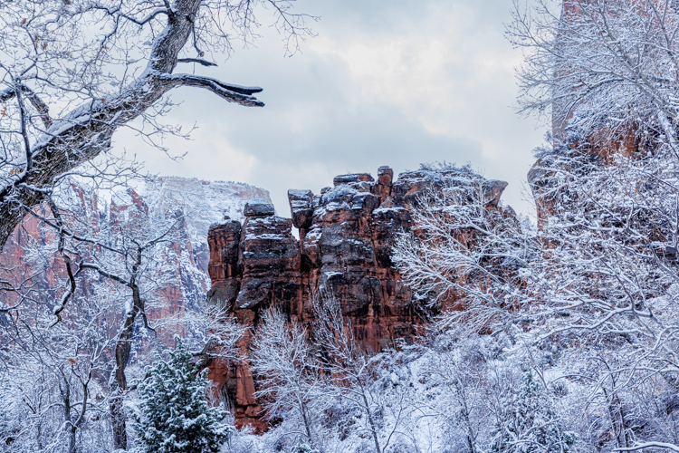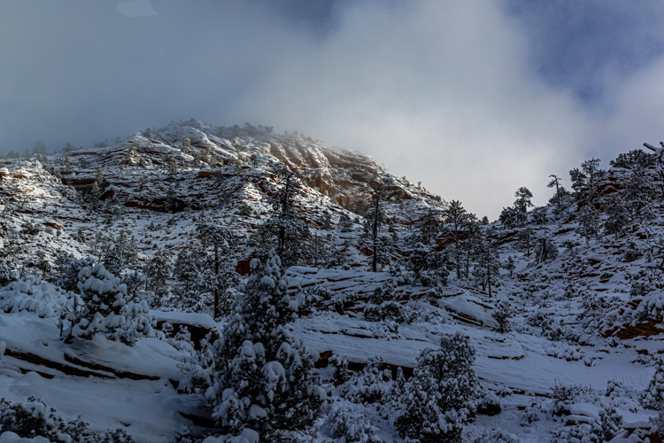 ザイオン国立公園に雪が降るとの天気予報を聞き、初雪の写真を撮りに出かけました。 We went to Zion National Park to take pictures because the weather report said it was going to snow.